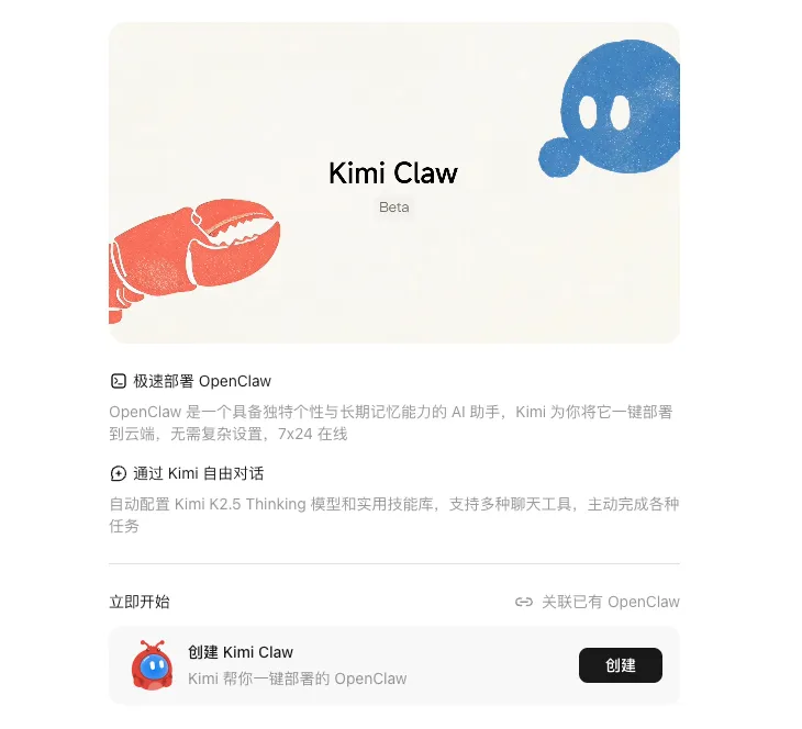 - One-Click Deployment: Create or link an OpenClaw instance directly in your browser tab at kimi.com/bot. No command line, no infrastructure management.